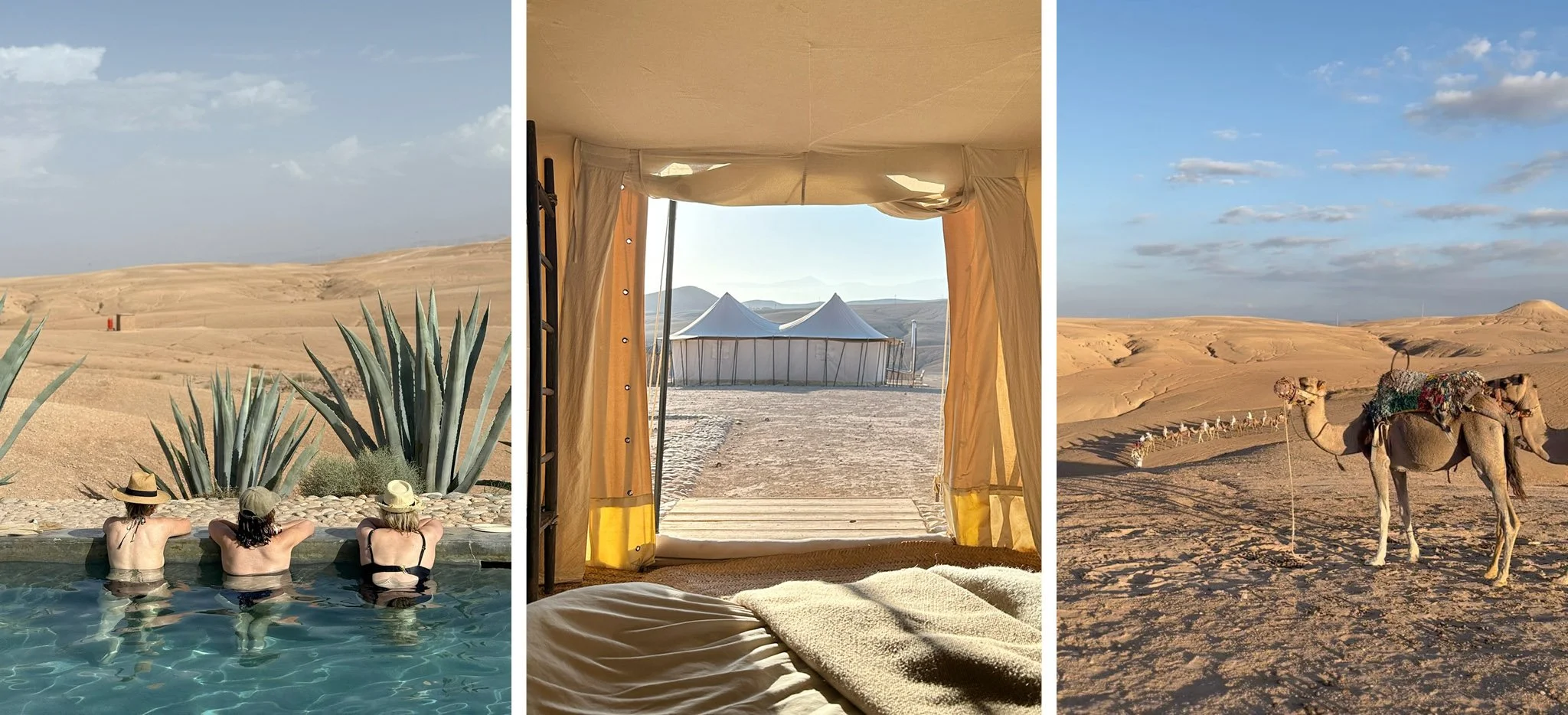 The excitement is building as we make our way to the majestic Agafay desert for the ultimate glamping stay! As we arrive, the mystique of the desert, and the backdrop of the High Atlas Mountains, is simply breath-taking.